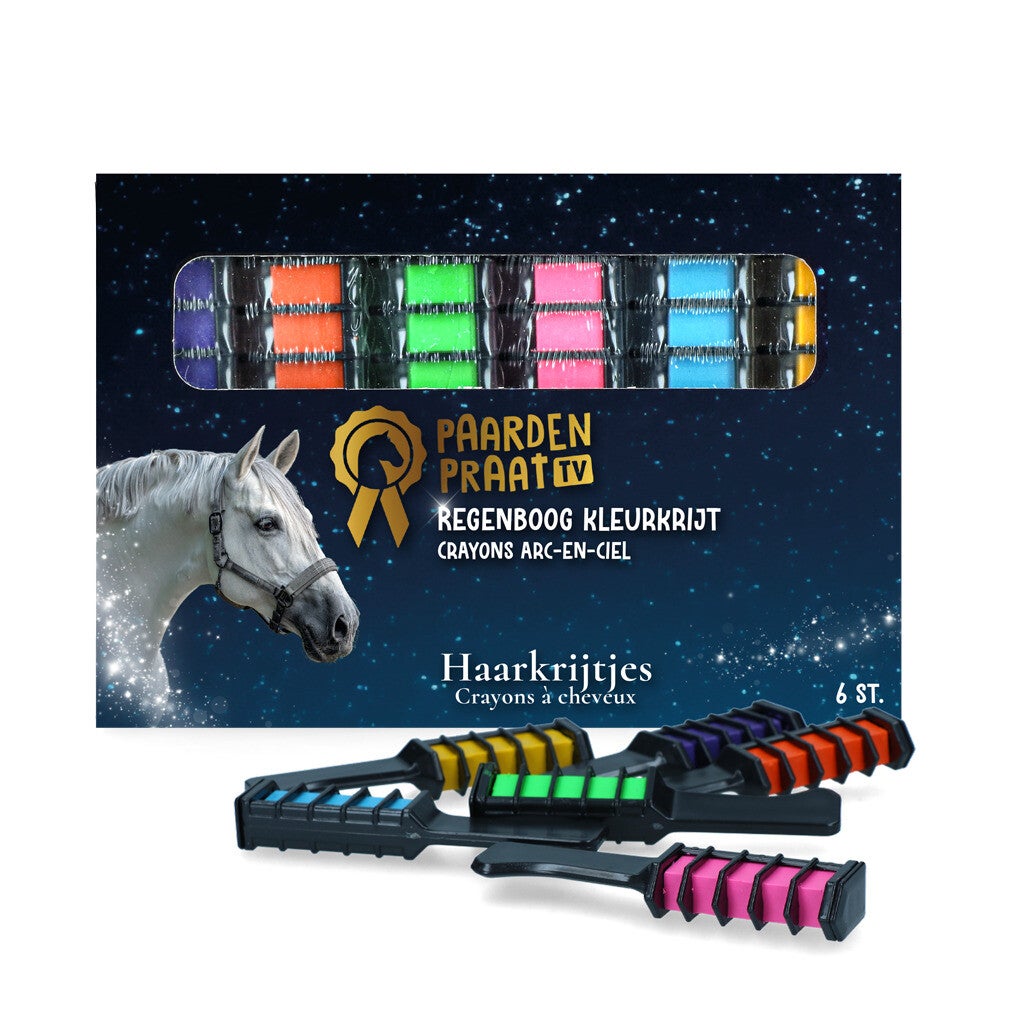 Heb je altijd al een eenhoorn willen hebben? Met deze vrolijke haarkrijtjes van Paardenpraat TV verander je je paard snel en makkelijk in een eenhoorn! Alle kleurtjes van de regenboog zitten samen in een verpakking.