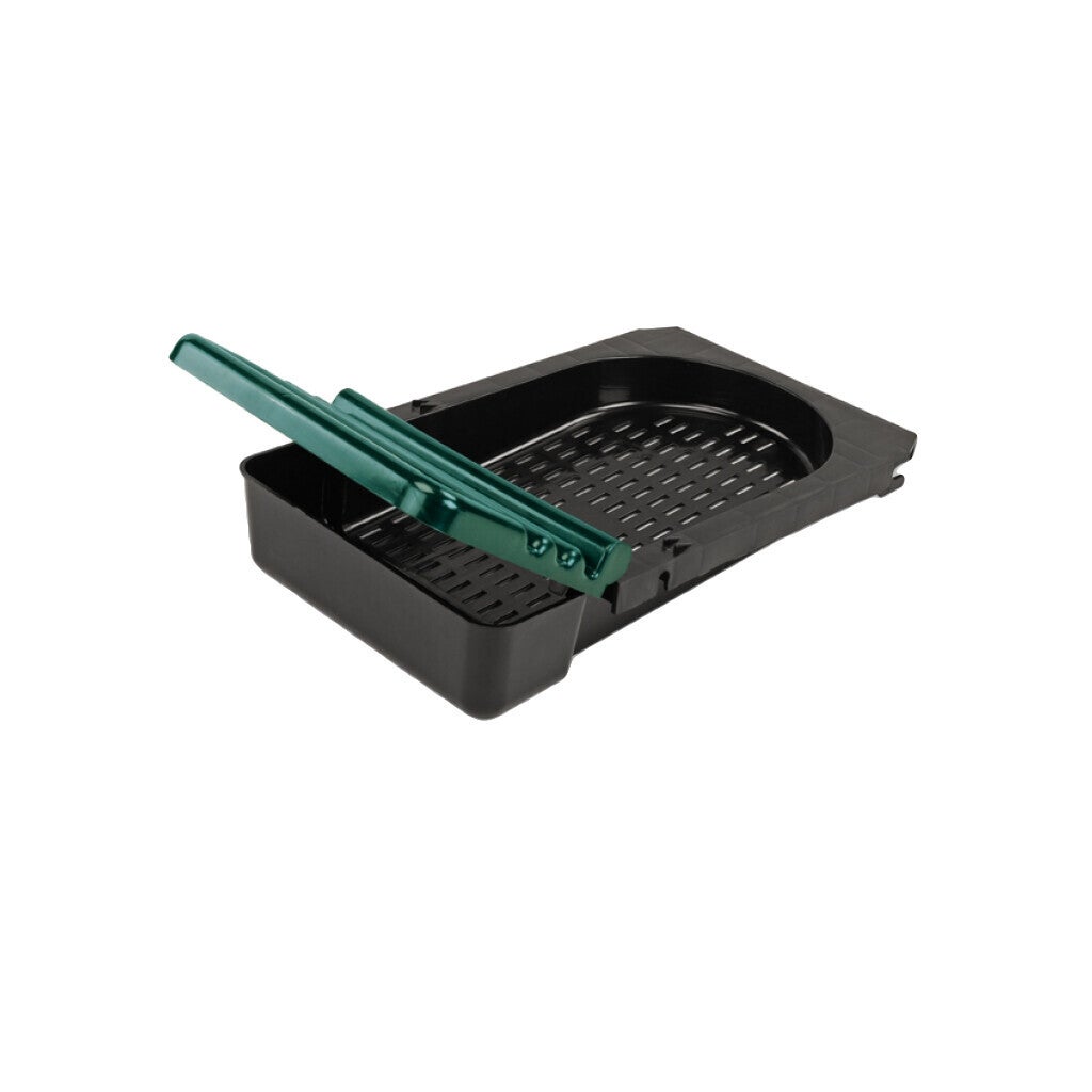 Inclusief een voor pluimvee onbereikbare opvangbak met deksel ter bescherming van de eieren.